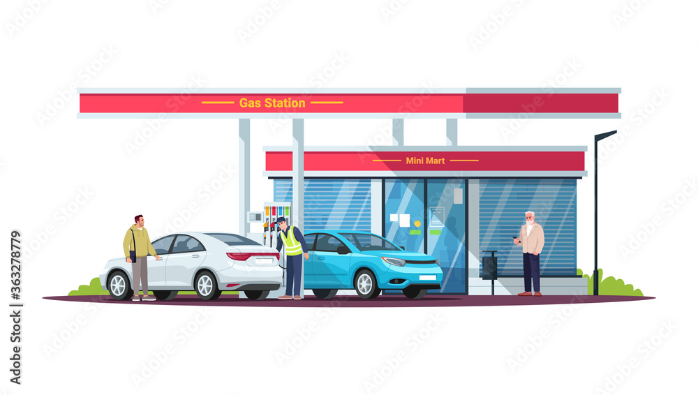 Gas Station With People Semi Flat Rgb Color Vector Illustration Attendant Servicing Diesel Gasoline Fuel Filling Station And Customers Isolated Cartoon Characters On White Background Stock Vector Adobe Stock